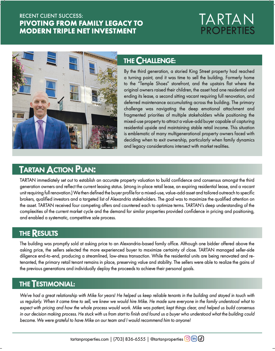 The building was promptly sold at asking price to an Alexandria-based family office. Although one bidder offered above the asking price, the sellers selected the more experienced buyer to maximize certainty of close. TARTAN managed seller-side diligence end-to-end, producing a streamlined, low-stress transaction. While the residential units are being renovated and retenanted, the primary retail tenant remains in place, preserving value and stability. The sellers were able to realize the gains of the previous generations and individually deploy the proceeds to achieve their personal goals.